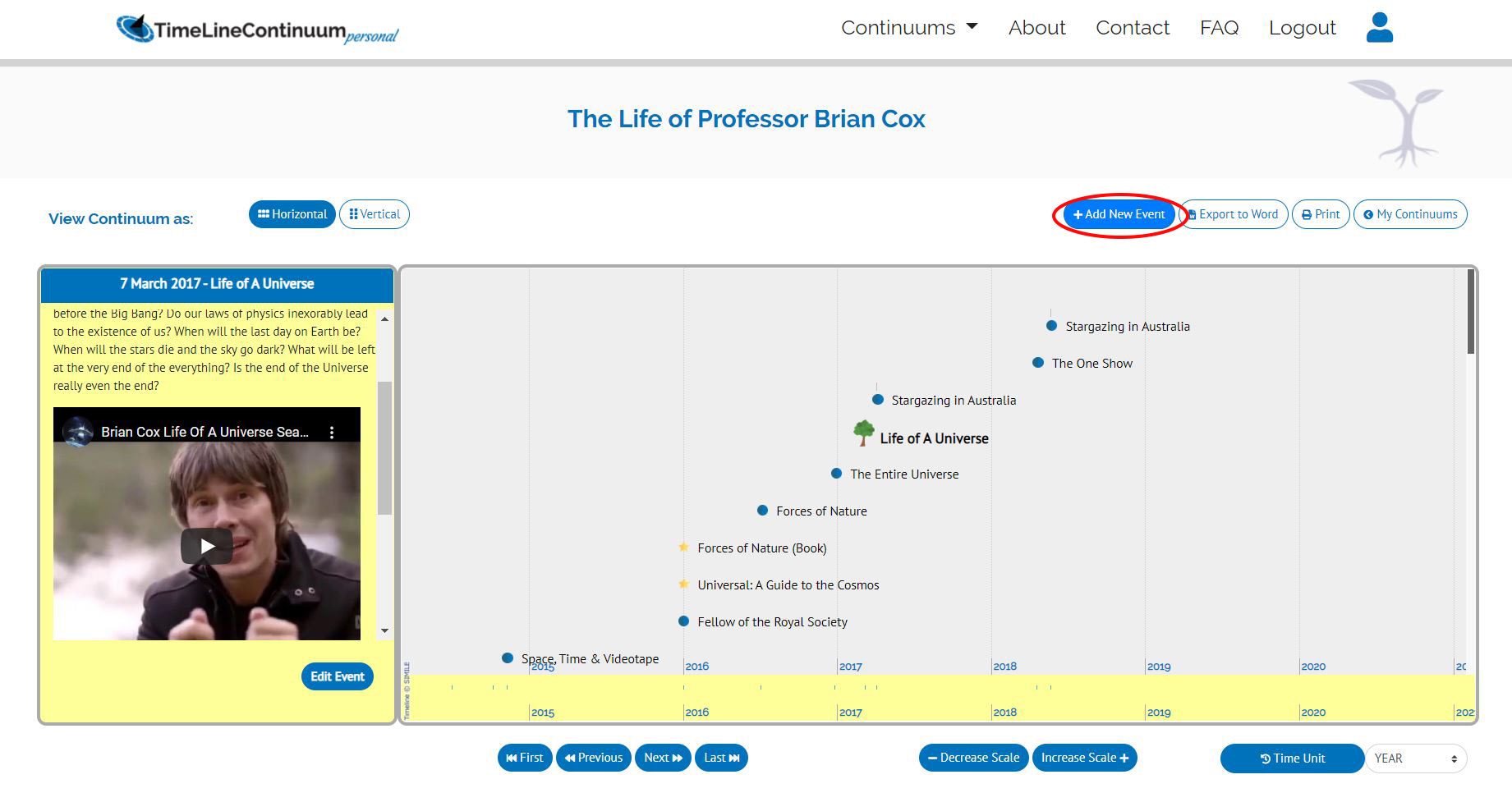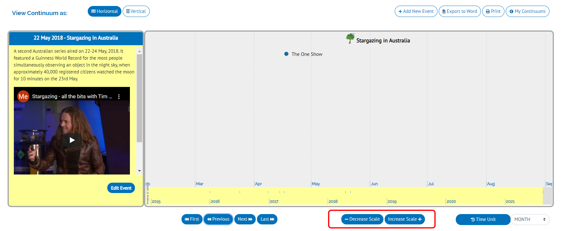 You can leave the Scale at 100%. Time Unit selection will be the default time unit view that you want your Continuum to be shown everytime you view it. You can view your Continuum in Day, Week, Month, Year and even Decade view. You can change these time unit views anytime later.
